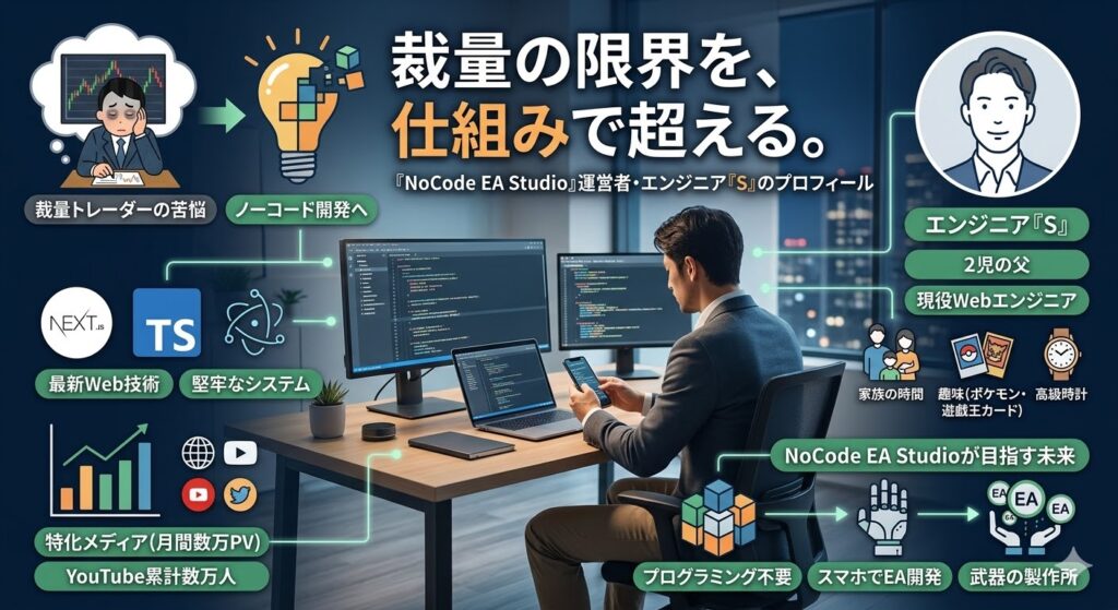 当サイトへお越しいただき、ありがとうございます。私は現在、現役のエンジニアとしてシステム開発に携わりながら、FX自動売買(EA)の民主化を目指し、本プラットフォームの開発・運営を行っています。
